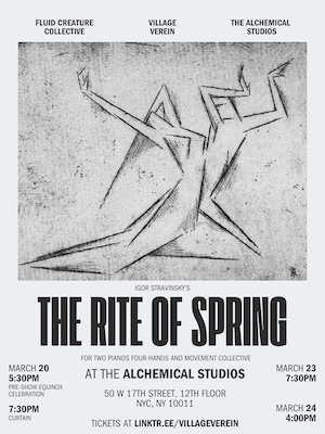 An engaging and experimental performance of Igor Stravinksy's The Rite of Spring perfomed on the 2023 Spring Equinox. With rehearsals starting at the beginning of the new year, this work was Village Verein's first experiment with choreography as we brought the Rite of life with Fluid Creature Collective. Selling out most of the performances, the Rite was a welcome start to the new season, bringing a fresh perspective to the iconic work. Electrically intimate, the work featured was performed piano four hands by Ethan Osman and Seth Schultheis. Megan McDevitt, Gary McCall, Sadi Weir, and Jess Lemcke of Fluid Creature performed the work, with Lo Poppy of Fluid Creature overseeing creative direction.
